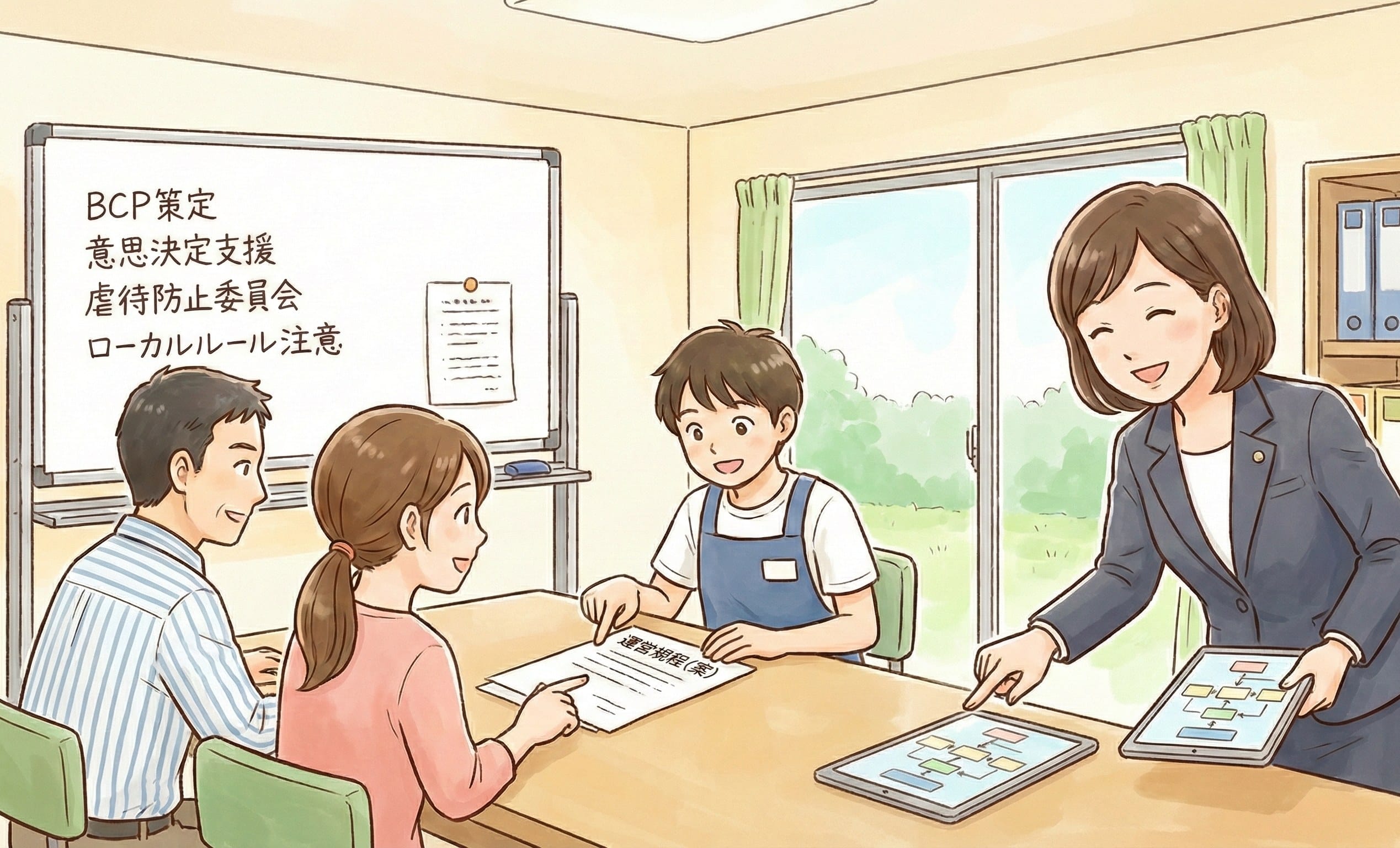 運営規程は、理念と実務をつなぐ最重要文書です。丁寧に作り込むことで、指定申請のスムーズな審査だけでなく、開設後の安定した運営と支援の質の向上にも直結します。
