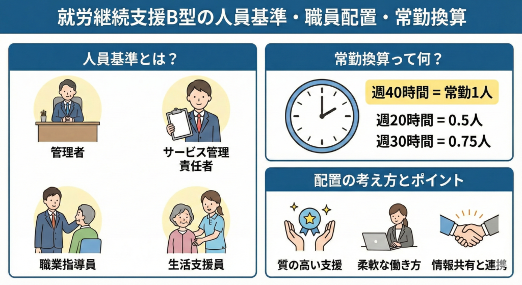 就労継続支援B型の運営では、利用者への支援を安定して提供するために「人員基準」と「職員配置」が定められています。今回は、どんな職種が必要なのか、そしてよく耳にする「常勤換算」とは何かについて整理します。 人員基準とは? B型事業所には、法律... -